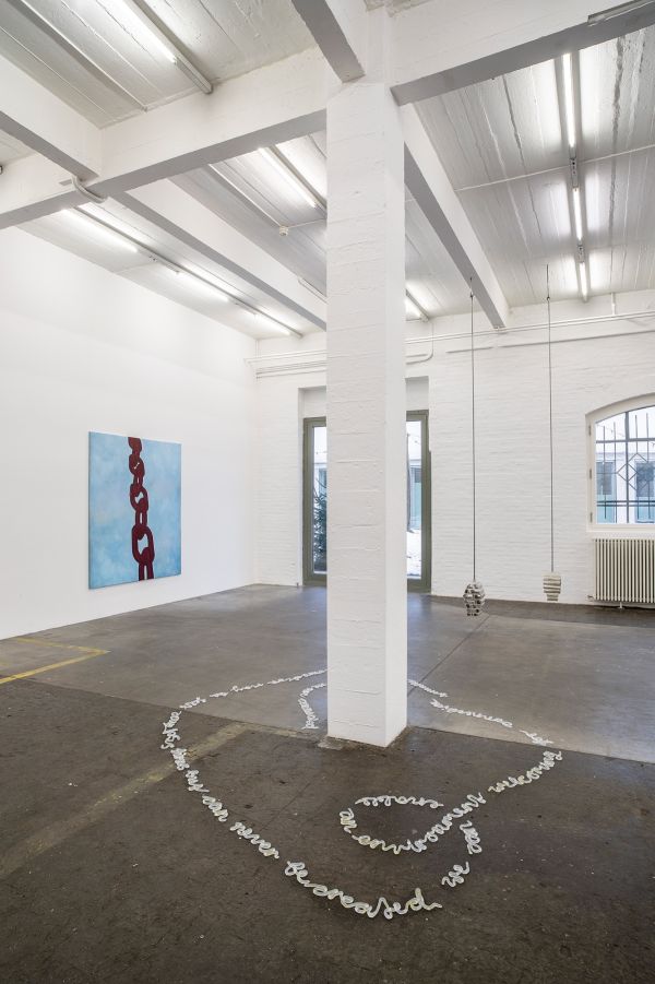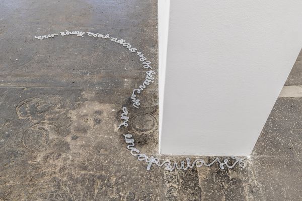 Die künstlerische Praxis von Cheyenne Oswald (*1995, lebt in Basel/CH) bewegt sich an der Schnittstelle zwischen Analysieren und Aktivieren. Dabei interes- siert sie das, was über das Betrachten hinausgeht und die Besucher*innen von ihren zugeschriebenen Rollen entlässt. Ihren Arbeiten ist gemeinsam, dass ihnen ein Recherche- und Planungsprozess vorausgeht, der meist von queer- feministischen Texten oder Biografien geprägt ist. Die für das Heimspiel ent- standene Installation ist nicht unmittelbar lesbar. Unaufgeregt ziehen sich in Silikon geformte Satzteile am Boden des Ausstellungsraumes entlang. Je nachdem wie man sich durch den Raum bewegt, setzen sich die Wörter je nach Ablauf zu neuen Bedeutungen zusammen. Die Satzfragmente sind Zitate oder Texte der Künstlerin selbst, die sich der bewussten Wahrnehmung widmen und neue Verbin- dungen schaffen.