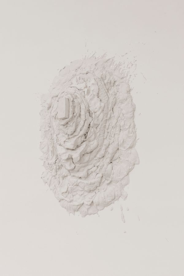 Christian Hörler zeigt in der Ausstellung eine Gipsarbeit, die ausgehend von ihrer jeweiligen Präsentation in Raum und Zeit stetig wächst. 2013 zum ersten Mal präsentiert, handelt es sich um eine Arbeit, die an den jeweiligen Ausstellungsort angebracht wird und mit der Gipsmasse ihres Grundes stetig wächst. Seine Arbeit ist somit als ein natürlich gewachsenes Handlungsfeld zu verstehen, das mit den Bedingungen der Schwerkraft und der Frage nach Skulptur und Malerei, Horizontalität und Vertikalität spielt.
