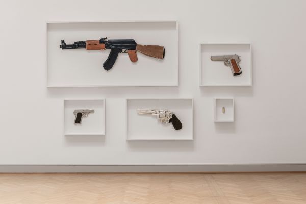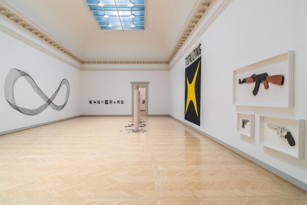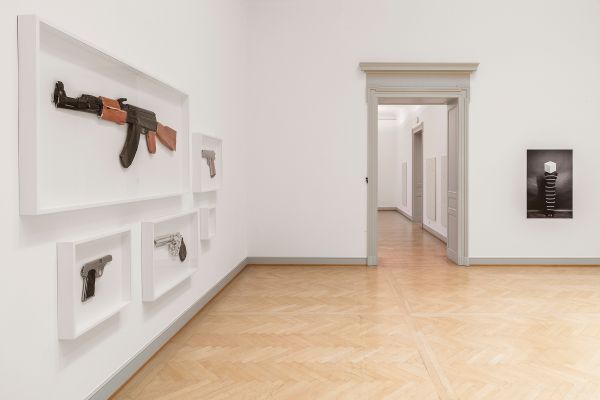 David Berweger präsentiert im Oberlichtsaal zwei Arbeiten. Bei der einen handelt es sich um Säulen mit dem Titel Veroneser Fackeln. Die andere ist eine Serie von durch Modellbausätze erstellte Objekte, die im Internet als Bastelbogen zu finden sind. Es handelt sich dabei jedoch nicht um Schlösser oder Burgen, sondern um Waffen. In Papier und Karton gebastelt und flachgedrückt werden sie gerahmt und zum ästhetischen Objekt. Grundsätzlich behandeln seine Arbeiten Themen der Imitation, Ambivalenz und Täuschung.