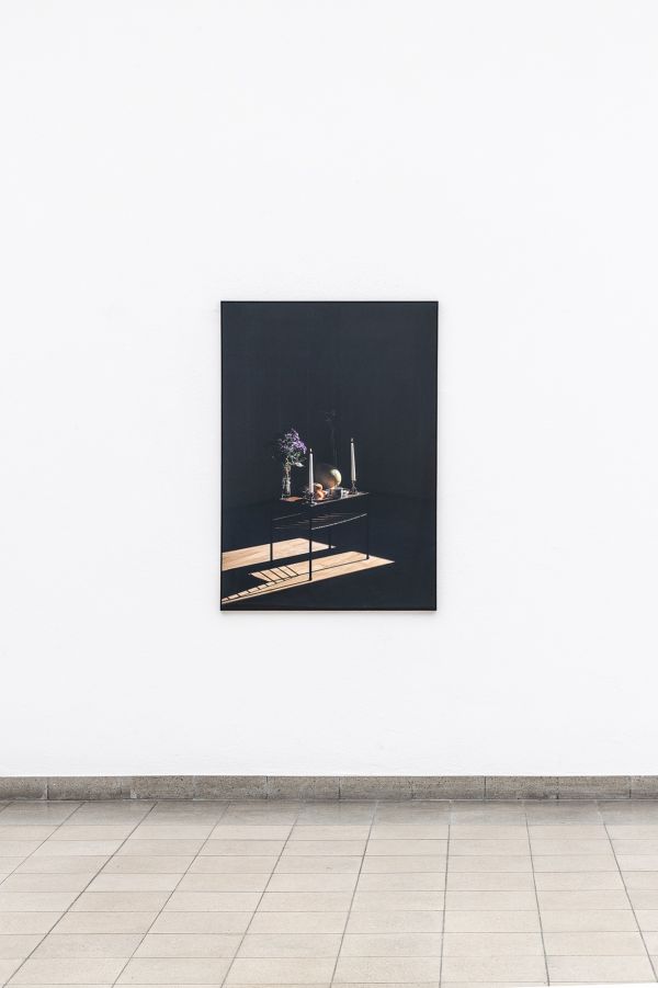 Das Foto Cúng Ritual, Ateliereinweihung (2021) von Thi My Lien Nguyen entstand im Rahmen einer Serie der Künstlerin, die sich kritisch mit den Zusammenhängen von Essen, Ritual und Traditionalismus auseinandergesetzt hatte. Dazu hat sie Archivbilder, analoge und digitale Fotos ihrer Familie zusammengetragen und eine letzte Aufnahme selbst erstellt, die nun als grossformatiger Abzug im Obergeschoss des Kunsthauses zu sehen ist. Thi My Lien Nguyen verleiht dem Einweihungsritual ihre ganz eigene Form, wobei sie auf bestehende spirituelle Charakteristika zurückgreift, aber gleichsam gestalterischen Einfluss nimmt, indem sie Auswahl und Anordnung der Gegenstände abwandelt, und auf diese Weise versucht, rigide Ideologien künstlerisch zu reflektieren.